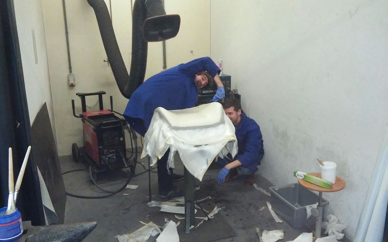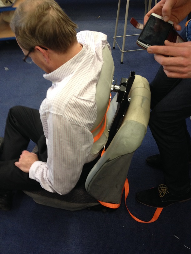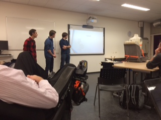 gingen hier vervolgens mee aan de slag, hierbij begeleid door docenten Jan Zijlstra en Bryan Williams. Het resultaat: de 'Nerve Reliever'. Ik heb een korset om, met op de rug een haak. Daarmee ga ik op de autostoel zitten, waarbij de haak in de rugleuning klikt.